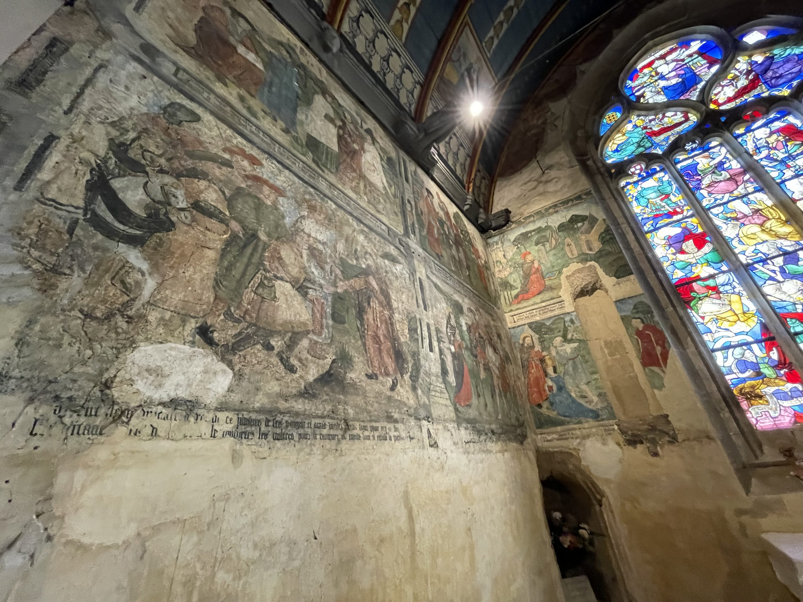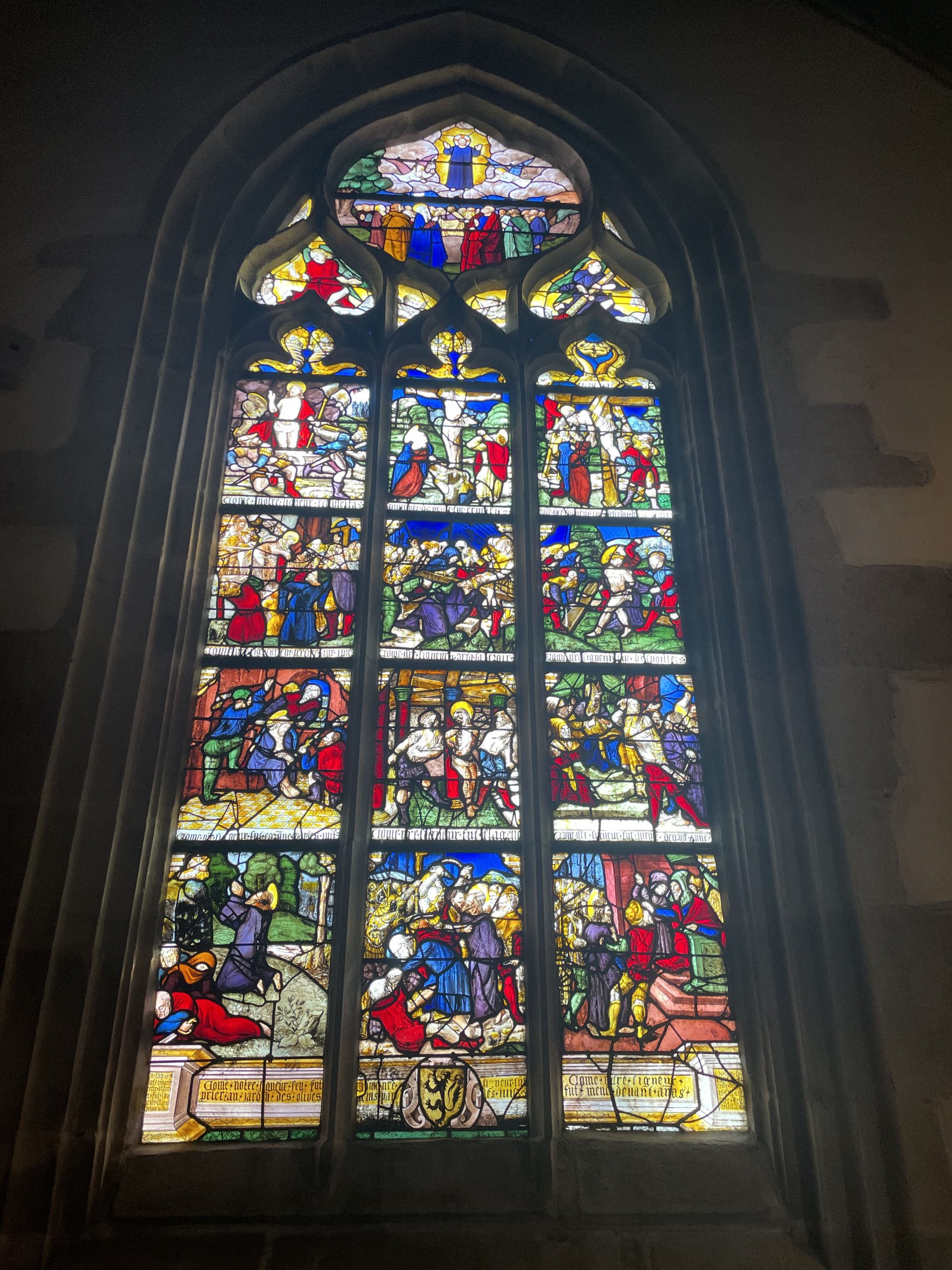 « En 2014, lors de la dépose du retable dans le bras sud du transept, une pierre de dédicace fut découverte sur laquelle est écrit : « Ceste oeuvre fut commancé le VIIIe jour de juillet l’an Mille CCCC XL VI ». Il est probable que cette date, 7 Juillet 1446, corresponde au début de construction du transept et du chœur dont les maçonneries sont de même facture. »1