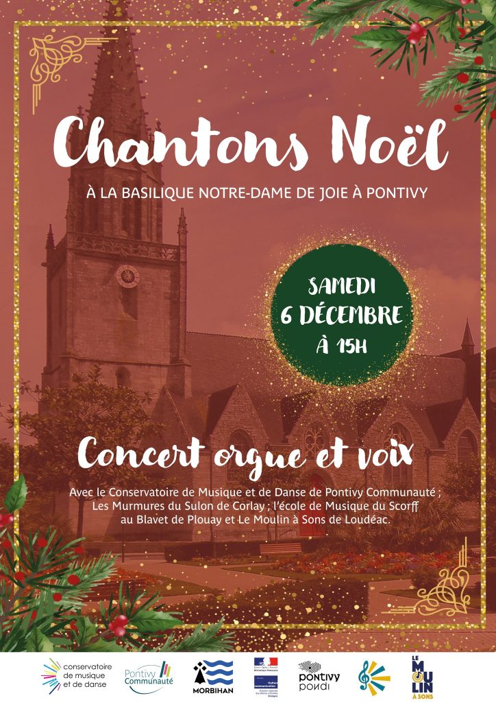 Le 6 Décembre à 15h se tiendra le concert « Chantons Noël », un concert orgue et voix avec le Conservatoire de Musique et de Danse de Pontivy Communauté, Les Murmures du Sulon de Corlay, l’école de Musique du Scorff au Blavet de Plouay et le Moulin à sons de Loudéac.