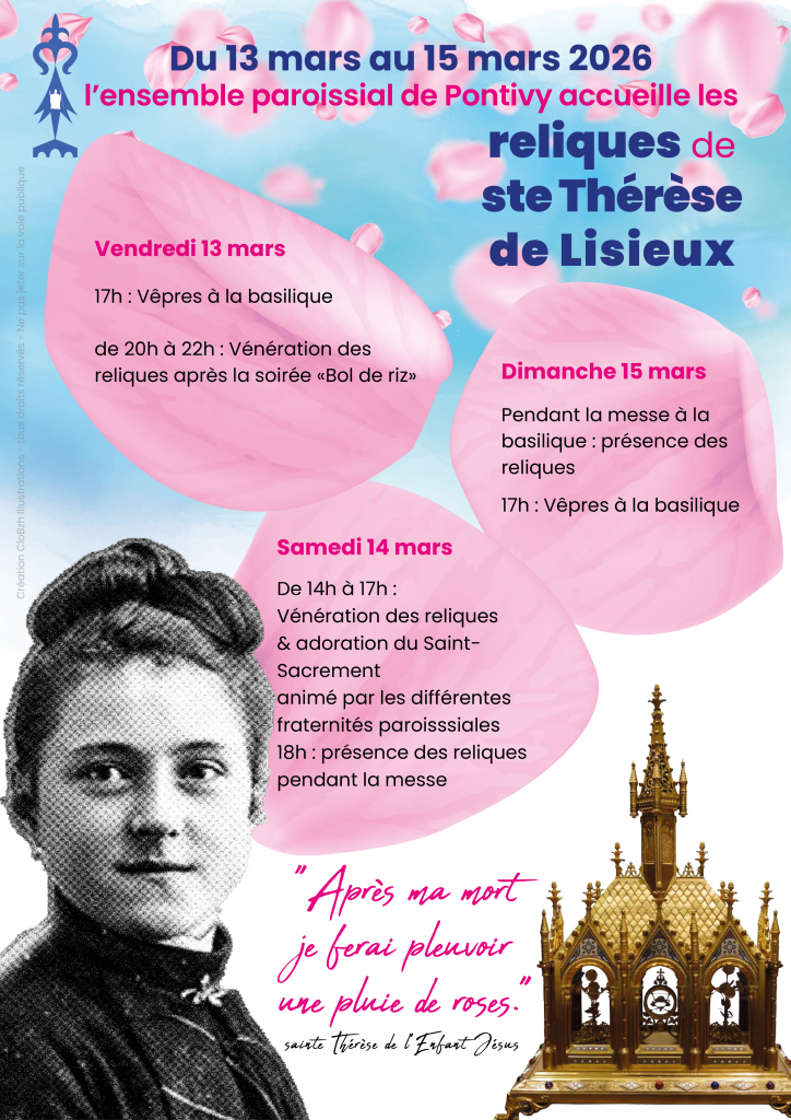 Du Vendredi 13 au Dimanche 15 Mars, notre Ensemble Paroissial de Pontivy a la joie d’accueillir les reliques de Sainte Thérèse de l’Enfant Jésus, pour un weekend exceptionnel de prière, d’adoration et de vénération auprès de la sainte carmélite, Docteur de l’Eglise et Patronne secondaire de la France.