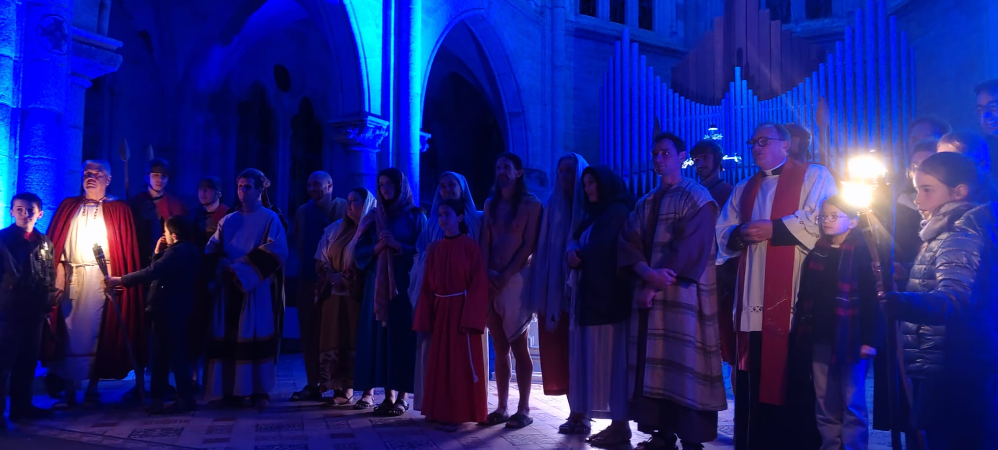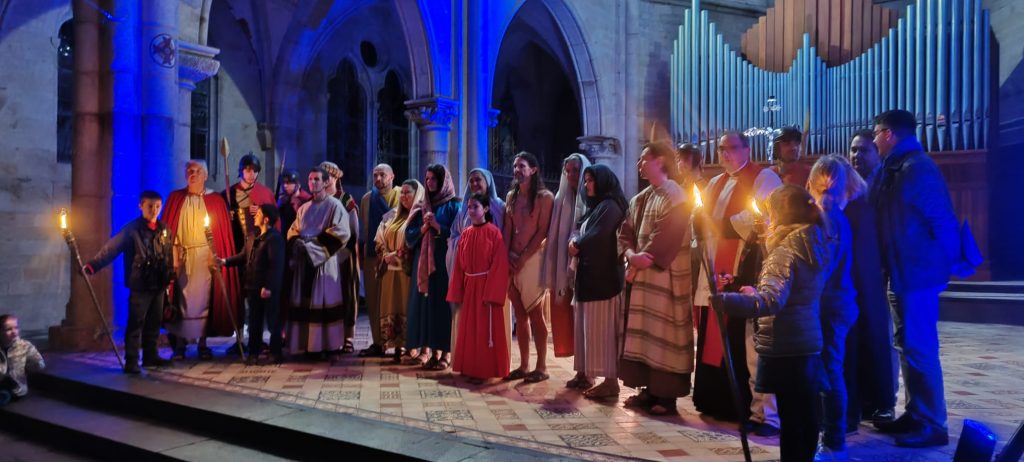Après la Messe du Jeudi Saint et l’Office de la Croix du Vendredi après-midi, comme l’année dernière, les bénévoles de notre Ensemble Paroissial avaient également organisé un Chemin de Croix vivant dans le Square Lenglier, autour de l’église Saint Joseph. Près de 150 personnes ont ainsi pu cheminer avec Jésus, méditer tout au long des 14 stations  les différents textes proposés, et se recueillir à la fin du Chemin de Croix dans une église Saint Joseph magnifiquement illuminée pour l’occasion.